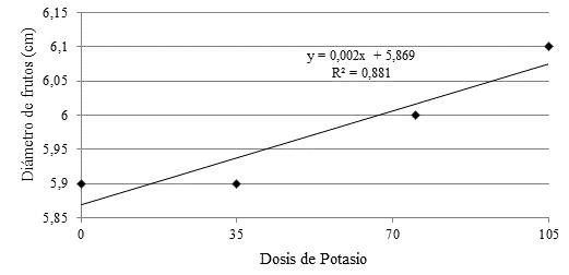 En cuanto a las dosis de potasio, las de 70 y 105 kg/ha indujeron frutos de diámetro con valores más altos, con 6,0 y 6,1 cm de diámetro, siendo superiores a lo obtenido con las otras dos dosis, que solo produjeron frutos de 5,9 cm de diámetro.