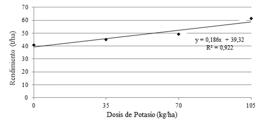 Figura 3. Regresión lineal para la determinación del rendimiento en función de la dosis de potasio. |