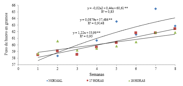 El efecto de los distintos programas de luz, demuestran que durante las 8 semanas que duró el experimento. Se observó diferencias significativas entre los tratamientos, para el peso del huevo donde el (T1) con luz natural logró mejor resultado hasta la séptima semana.