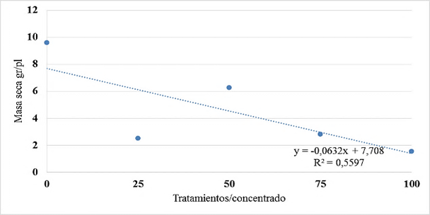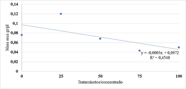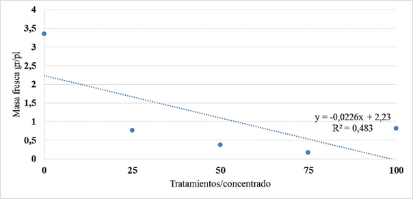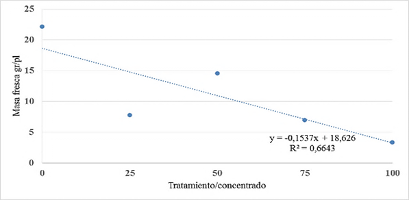 En la figura 4 se presenta la relación entre las concentraciones y la masa fresca de sésamo, sigue un modelo lineal del tipo y = ax + b; es decir, que presenta un crecimiento lineal negativo y que a medida que aumentan los valores en el eje X, disminuyen los valores del eje Y en forma decreciente.