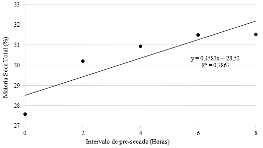 En la Figura 1 se detalla la regresión realizada para la determinación de Materia Seca Total (MST) en el pasto Brachiaria brizantha Cv. Marandú relacionando con los tratamientos (horas de pre-secado), se observa que la ecuación generada (y= 0,4583x+28,52), así también el coeficiente de determinación (R2) que fue de 0,78; la cual se ajusta a una ecuación lineal positiva. Como se puede apreciar en la Figura 1 los resultados del experimento indican que para el T1= 0 horas, T2= 2 horas, T3= 4 horas, T4= 6 horas, y T5= 8 horas de pre-secado se obtuvieron medias de 27,6; 30,1; 30,9; 31,5 y 31,5 % respectivamente. Este comportamiento ascendente de la Materia Seca Total se pudo haber dado a consecuencia del aumento del intervalo de tiempo del pre-secado, esto pudo ser debido a la influencia directa de los rayos solares que hicieron que se pierda contenido de agua del pasto cortado. En discrepancia con Soares et al. (2009) que trabajando con la influencia de la luminosidad en el comportamiento de forrajeras como Brachiaria brizantha cv. Marandú, Tanzania y Mombasa encontró que la producción media de MST disminuye con relación a la intensidad luminosa, De esta forma, el régimen de radiación fue la variable principal, por sus efectos en la fotosíntesis y otros procesos fisiológicos, como transpiración y absorción.