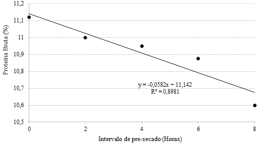 Figura 2. Análisis de regresión entre proteína bruta relacionando con los tratamientos (horas de pre-secado). |