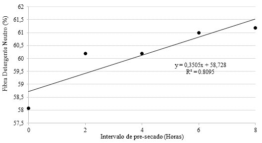 En cuanto al porcentaje de Fibra Detergente Neutro se apreciaron mejores resultados realizando un pre-secado de 0 a 8 horas respectivamente. Por otro lado. el porcentaje de Fibra Detergente Ácida no se encontraron diferencias significativas entre los tratamientos aplicados.