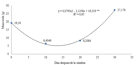 La ecuación generada es y= 0,0793x2 – 2,1238x + 19,319**; así también el coeficiente de determinación (R2) que fue de 0,95; es decir, el 95% de la suma de cuadrados totales de la determinación de Masa verde total en gramos es explicada a través de la relación lineal.