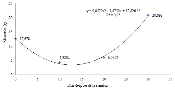 Como se puede observar en la Figura 3 de la ecuación obtenida, por cada 1,4750 incrementado en la cantidad de días (DDS), se aumenta 12,826 gramos de masa seca total. En el En el T1 (testigo) T2 (10 DDS), T3 (20 DDS) y T4 (30 DDS) se obtuvieron medias de 12,678 g; 4,3202 g; 6,0702 g y 20,898 g respectivamente.