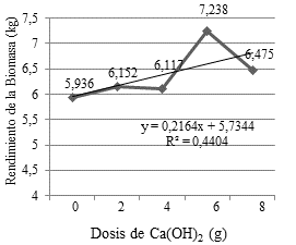La dosis recomendada para la aplicación de Ca(OH)2/L de agua, es de 6 g por cada un litro de agua para obtener 7,238 kg de biomasa total; utilizando semillas de buena calidad con un poder germinativo del 90%; y para obtener una óptima producción de proteína bruta lo recomendable es utilizar 4 g Ca(OH)2/L de agua.