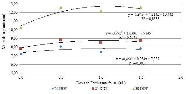 Con la aplicación de dosis crecientes de fertilizante foliar se obtuvieron respuestas positivas en el aumento de la altura hasta el punto de máxima eficiencia técnica (MET), posterior al cual los valores en altura comenzaron a disminuir a medida que aumentaban las dosis, este comportamiento se observó a los 20, 25 y 30 DDT. Con la aplicación de 0,5 g/L de fertilizante foliar se obtuvieron los mayores valores en altura de la planta, en comparación con los demás tratamientos a los 20, 25 y 30 DDT.