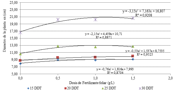 La menor altura fue de 10,27 cm para el tratamiento que no recibió aplicación de fertilizante foliar. Además, el modelo polinomial presenta un coeficiente de determinación de 0,92; considerado muy aceptable para el modelo generalizado, lo que indica que el 92% de la suma de cuadrados totales de la determinación del diámetro de la planta es explicada a través de esta relación polinomial (Báez et al, 2002).