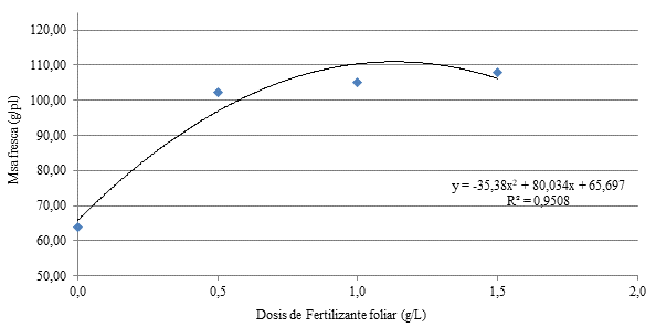 Figura 3. Variación de la masa fresca de la planta bajo la aplicación de distintas dosis de fertilizante foliar. |