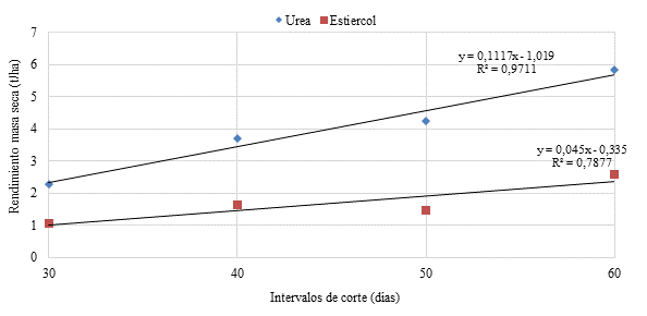 Con respecto a la masa verde, hubo interacción entre factores, presentaron los mayores rendimientos los fertilizados con urea a partir de los 50 días de corte y un comportamiento sin fluctuaciones hasta los 40 días de corte.