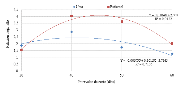Para la relación hoja/tallo el tratamiento testigo fue superior. En comparación entre fertilizantes nitrogenados la fertilización a base de estiércol bovino presentó mayores resultados con intervalos de corte a los 40 días.