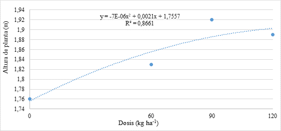 Las curvas de respuesta de la altura de las plantas al final del ciclo del cultivo para el cultivo del maíz en función a la aplicación de dosis creciente de fertilizantes nitrogenados se ajustan a la ecuación cuadrática (figura 1), donde al incrementar el valor de X (dosis de fertilizante) disminuye el valor de Y que es el rendimiento del maíz, lo que puede describirse como la ley de rendimiento decreciente, señalado por Mitscherlich (Fatecha, 1999).
