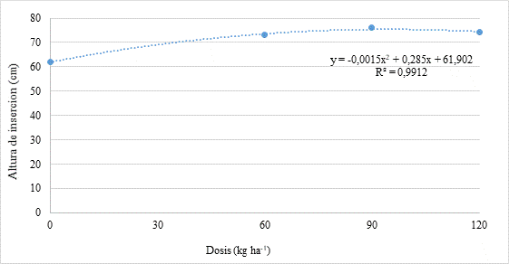 Siguiendo con la misma tabla (3) se notan los resultados de las dosis utilizadas en el experimento que se obtuvieron diferencias estadísticas, lo cual el mejor resultado se obtuvo con la dosis de 90 kg ha-1 con 0,76 m de altura de inserción de las plantas del maíz tupi pyta`i, también se observa que el tratamiento que no recibió fertilización fue la que menor valor presentó.