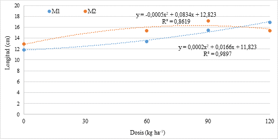Las curvas de respuesta la longitud de la mazorca de maíz del factor A (Momento de aplicación) y el factor B (dosis de N) se ajusta a la ecuación cuadrática para ambos momentos de aplicación del nitrógeno, para el M1 presenta un coeficiente R2 de 0,98 (Figura 3) sigue un modelo de ecuación cuadrática de y = 0,0002x2 + 0,0166x + 11,823 y para el M2 presenta un coeficiente R2 de 0,86 sigue un modelo de ecuación cuadrática de y = -0,0005x2 + 0,0834x + 12,823.