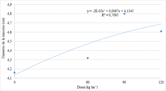 Las curvas de respuesta de diámetro de mazorca obtenidos para el cultivo del maíz en función a la aplicación de dosis creciente de Nitrógeno para se ajustan a la ecuación cuadrática (figura 4), donde al incrementar el valor de X disminuye el valor de Y que es el rendimiento, lo que puede explicarse la ley de rendimiento decreciente, señalado por Mitscherlich (Fatecha, 1999).