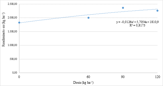Las curvas de respuesta de la producción de granos obtenidos para el cultivo del maíz en función a la aplicación de dosis creciente de fertilizantes nitrogenados se ajustan a la ecuación cuadrática (figura 5), donde al incrementar el valor de X (dosis del fertilizante) disminuye el valor de Y que pertenece al rendimiento, lo que puede explicarse la ley de rendimiento decreciente, señalado por Mitscherlich (Fatecha, 1999).