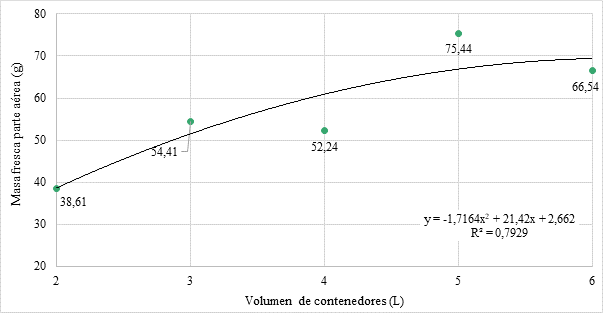Figura 2. Curva de respuesta ajustada de volúmenes de contenedores, para masa fresca parte aérea. Concepción, 2020. |