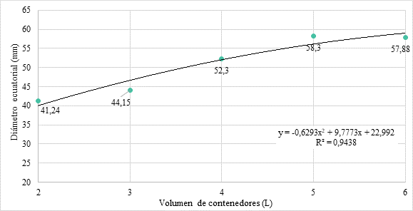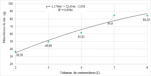 El análisis de regresión realizado, señala la ecuación y = -1,1764x2 + 22,414x – 5,058 y un coeficiente R2 de 0,9564. Considerando los volúmenes de contenedores evaluados, los de 5 y 6 litros de capacidad logran los mejores resultados (84,60 y 84,24 g) respectivamente, resultando iguales estadísticamente entre sí, y superiores a los demás volúmenes de contenedores evaluados en la investigación.