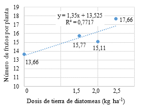Entre las dosis utilizadas de la tierra de diatomeas se obtuvo diferencias significativas; el mejor resultado se obtuvo con la dosis de 2,5 kg ha-1 con 17,66 frutos planta-1.