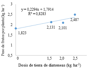 Las curvas de respuesta del peso promedio de los frutos por plantas, se ajustó mejor a la ecuación lineal positiva para las dosis de la tierra diatomeas (Figura 2), donde al incrementar el valor de X (dosis) aumenta el valor de Y, que es el peso de los frutos por plantas.