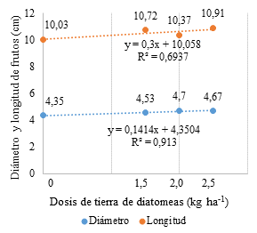 En cuanto a las diferentes dosis de tierra de diatomeas, se nota que se obtuvieron diferencias significativas a nivel estadístico. El mejor resultado para el diámetro de los frutos se logró con las dosis de 1,5 y 2 kg ha-1 con 4,70 y 4,67 cm por fruto respectivamente y para la longitud de frutos con las dosis de 2,0 y 2,5 kg ha-1 con 10,91 y 10,72 cm por fruto, además se observa que el tratamiento que presentó menor valor es el testigo, es decir, que no recibió fertilización a base de tierra diatomeas con 10,3 cm por fruto.