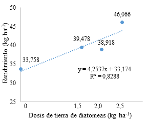 Las curvas de respuesta del rendimiento de tomate, se ajustó mejor a la ecuación lineal positiva para las dosis de la tierra diatomeas (Figura 4), donde al incrementar la dosis aumenta el valor del rendimiento.