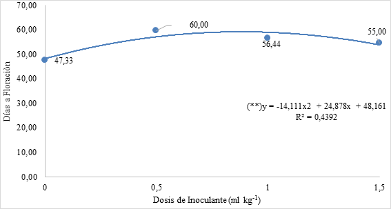 Figura 1. Curva ajustada entre dosis de inoculante y días a floración en híbridos de sorgo granífero. |