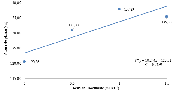 Se observa en la figura 2, un comportamiento ascendente hasta la dosis de 1,0 ml kg-1 de semilla, luego decae al aumentar la dosis del inoculante aplicado. Las medias obtenidas para esta variable fueron menores, considerando las características de los híbridos (que va de 130 a 190 cm, respectivamente).