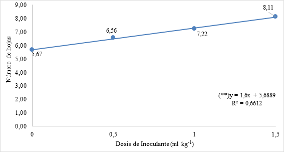 La relación entre dosis de inoculante y el número de hojas se presenta en la Figura 3. Esta relación indicada sigue un modelo lineal. El coeficiente de determinación resultante fue de 0,6612.