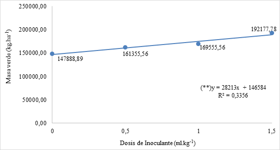 Los resultados obtenidos, correspondientes al TS (diferentes dosis de A. brasilense), lograron evidenciar estadísticamente diferencias significativas entre los tratamientos estudiados. En la Figura 4, se presentan las medias de la masa verde de los tres híbridos, obtenidas con la aplicación de diferentes dosis de A. brasilense. Además, se presenta la ecuación de regresión y el coeficiente R2 correspondiente a la regresión polinómica de segundo grado. Se observa que entre las dosis del inoculante aplicado y la masa verde (MV) en híbridos de sorgo granífero existe una baja relación, considerando el coeficiente de determinación (R2=0,3356).