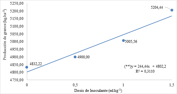 En la Figura 5, se puede observar que existe un aumento en la producción de granos, conforme al aumento de la dosis de inoculante aplicado, ajustándose a una ecuación lineal. La menor producción obtenida fue de 4.832,22 kg ha-1 en el tratamiento sin aplicación de inoculante y el más elevado (5204,44 kg ha-1) se obtuvo con la dosis máxima aplicada de 1,5 ml ha-1 de semilla. En este sentido, la dosis de máxima eficiencia técnica se obtendría con dosis mayores a las utilizadas en este experimento.
