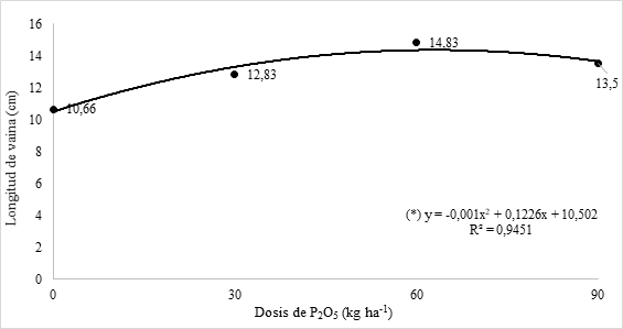 Los resultados del análisis de regresión entre la dosis de P2O5 y la longitud de vaina de poroto se muestran en la Figura 1. La ecuación obtenida en la figura muestra un comportamiento cuadrático, con un coeficiente de determinación de R2: 0,94. De acuerdo a los resultados de la ecuación, llegó alcanzar una longitud máxima de 14,26 centímetros con una dosis máxima estimada de 61,30 kg ha-1 de P2O5. Posteriormente, la longitud de vaina disminuye con el aumento de la cantidad de fertilizante fosfatado aplicado. El presente resultado concuerda con lo reportado por Huamán (2021) quienes observaron diferencias significativas en la variable de longitud de vaina, al evaluar la influencia del fósforo en el comportamiento agronómico del cultivo de poroto (Vigna unguiculata L. Walp), así también obtuvo un promedio general de 14,05 cm de longitud.