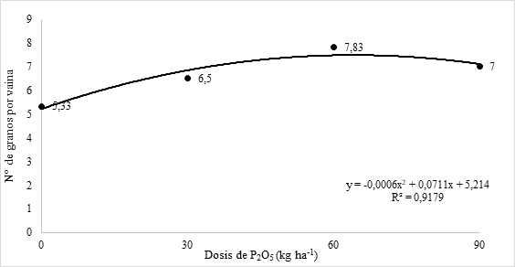 La ecuación obtenida en la figura 2 muestra un comportamiento cuadrático, alcanzando un punto máximo de número de granos por vaina con un valor de 7,32 granos, con la dosis estimada de 59,25 kg ha-1 de P2O5. Posteriormente, el número de granos por vaina disminuye con el aumento de la cantidad de fertilizante fosfatado aplicado. Alemán et al. (2019) en su investigación sobre los componentes de rendimientos a la respuesta de dosis de cal agrícola y fósforo en poroto (Vigna unguiculata L. Walp.), obtuvieron una diferencia significativa por efecto de fósforo en la variable de número de granos por vaina, logrando una media de 10 granos, considerablemente superior a lo obtenido en este experimento. La disparidad en los resultados podría atribuirse a diferencias en la variedad de poroto utilizada, el tipo de suelo y las condiciones climáticas en los lugares donde se llevaron a cabo los estudios.