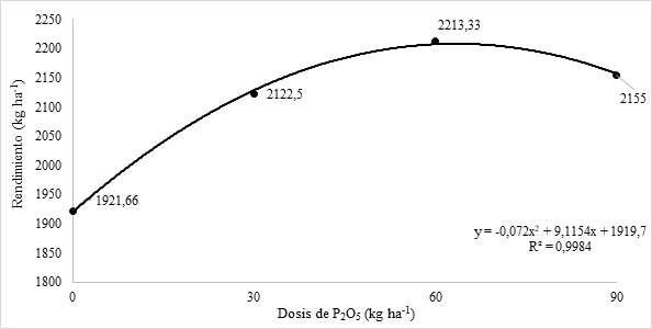 En la Figura 3 se presentan el análisis de regresión la dosis de P2O5 y el rendimiento de poroto. Se evidencia que, la ecuación se ajusta a un modelo cuadrático, nos indica se produjo aumentó de rendimiento hasta la dosis de 60 kg ha-1 y luego va disminuyendo con el incremento de fertilizante fosfatado aplicado. De acuerdo a la ecuación obtenida, se produjo un rendimiento máximo de 2208,21 kg ha-1 y la dosis máxima estimada fue de 63,30 kg ha-1 de P2O5.